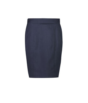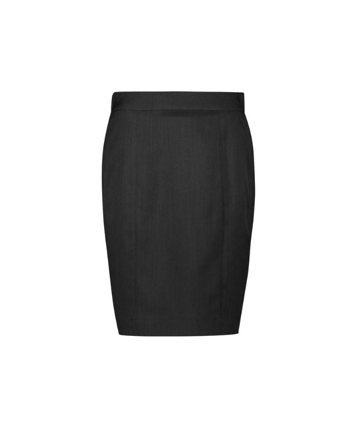 - A modern Cool Stretch mid-waist pencil skirt with encased elastic on waistband sides.