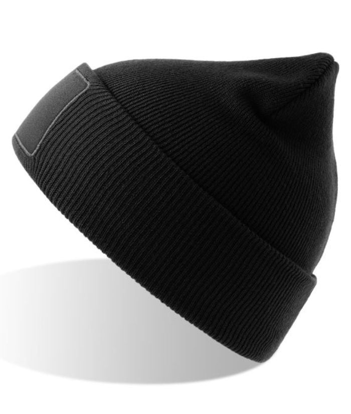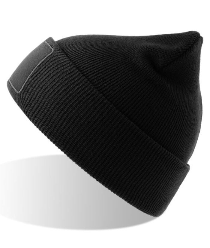 This classic beanie made from recycled polyester yarn is now enhanced with a large customizable maxi front patch, also made from recycled polyester, making it perfect for transfers.