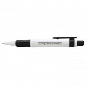 Retractable plastic ball pen with a white barrel, a soft rubber grip