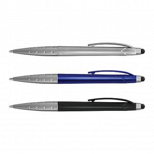 Twist action plastic ball pen with a metallic barrel, metallic silver trim and a stylus for use with touch screens. It has a black refill with 500 metres of writing ink and a tungsten carbide ball for improved writing quality