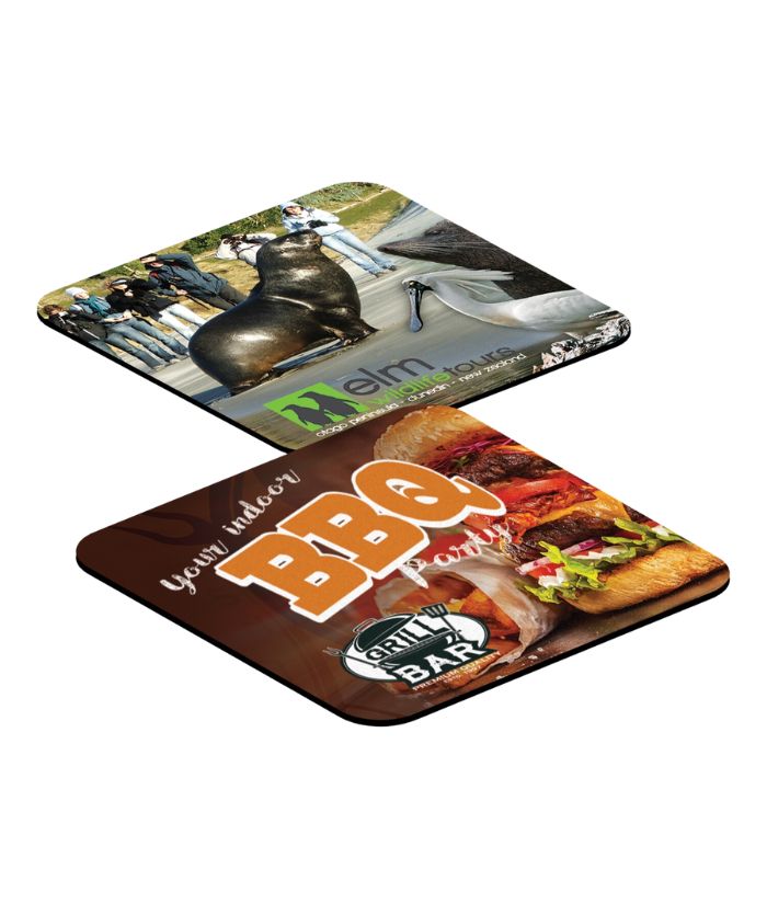 Flexible anti-slip rubber backed coaster which can be washed and reused.