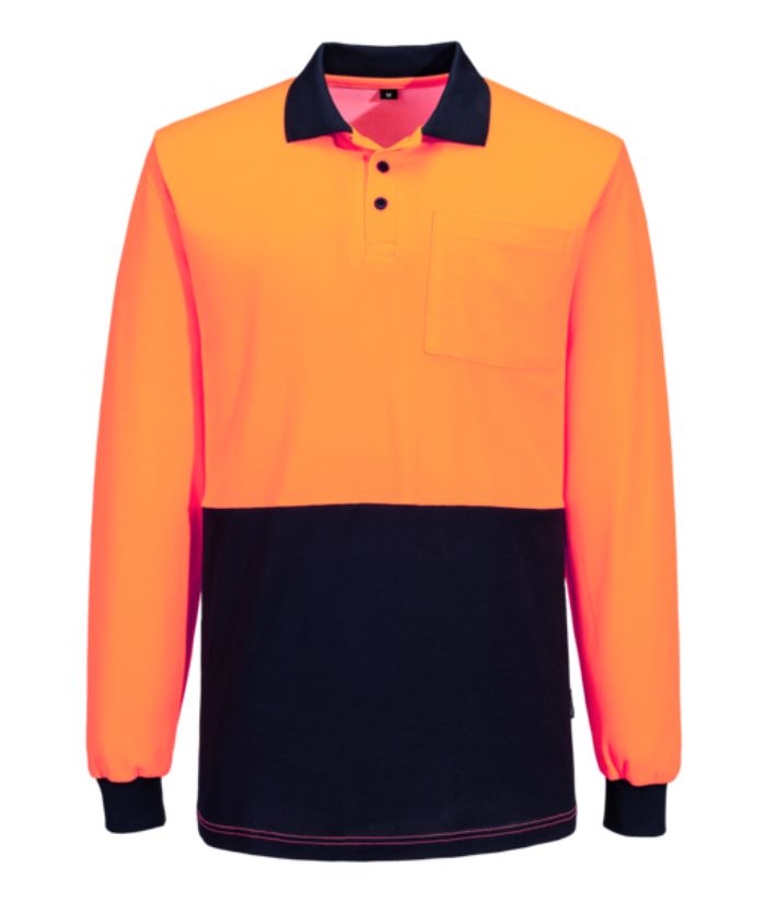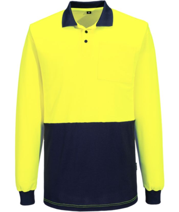 Cotton Comfort Long Sleeve Polo shirt, Chest pocket, Contrast navy to lower body, 3 button placket, rib collar and cuff in contrast navy.