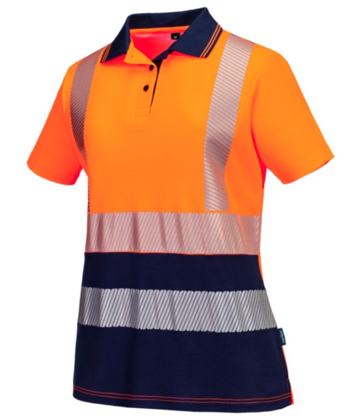 Cotton Comfort Short Sleeve Women's Polo shirt with segmented tape to torso, Contrast navy to lower body, 3 button placket and rib collar in contrast navy.