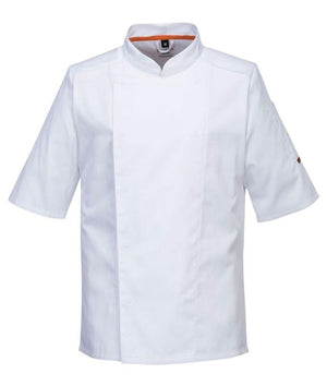 Double breasted concealed front fastening and pen pocket. This chefs jacket has been designed for style and practicality.