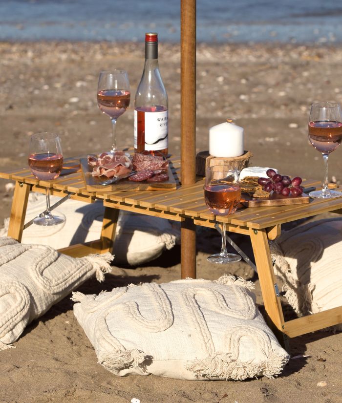 Foldable/Packable - 18 slat alfresco table with four integrated wine glass holders and a centre umbrella hole