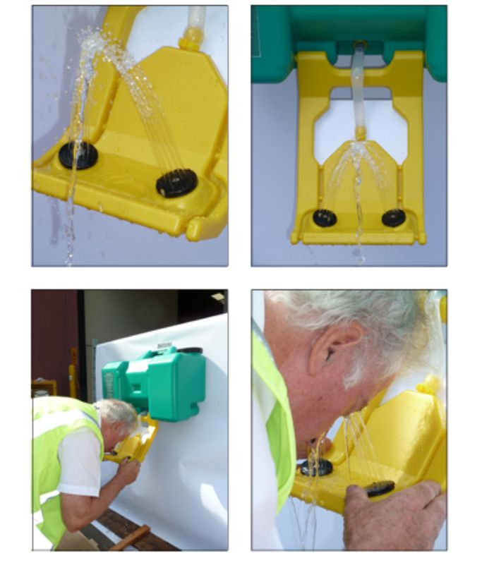 - Fold down the eye wash tray to activate the water flow.
