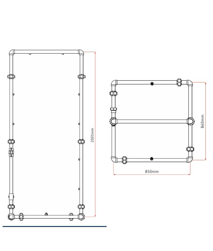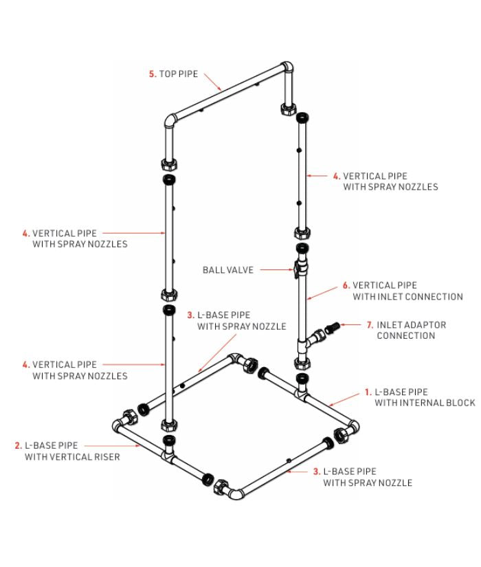 - The shower is fitted with an on / off valve and with 10 spray nozzles to provide a complete blanket of water spray from top to bottom, for quick decontamination