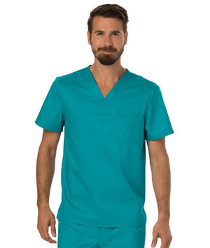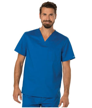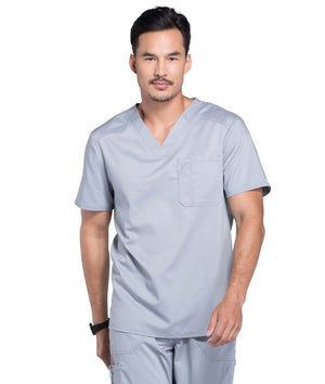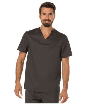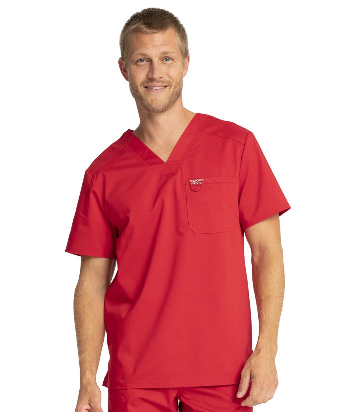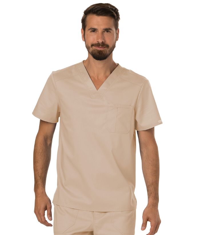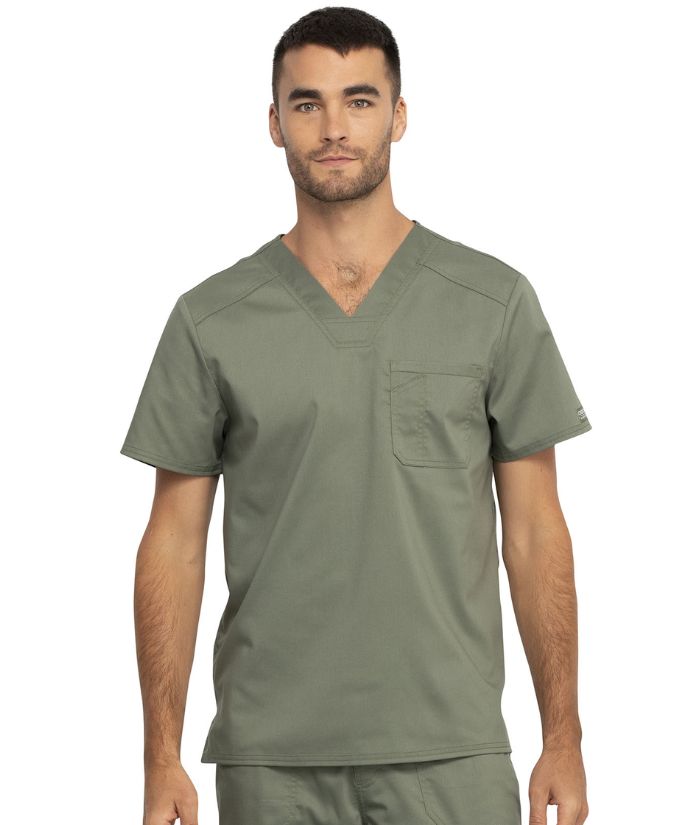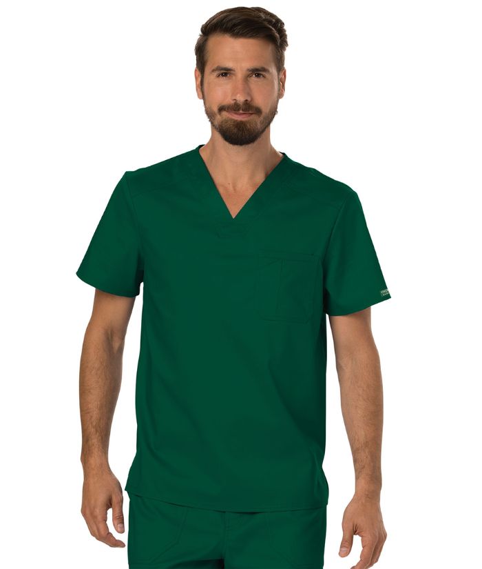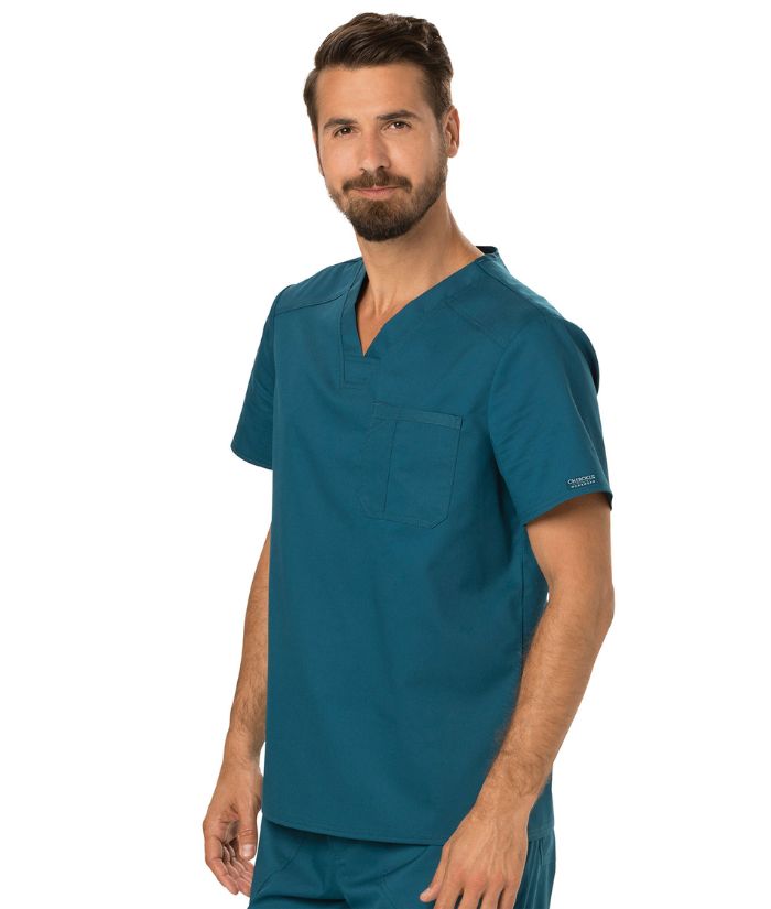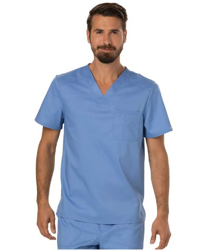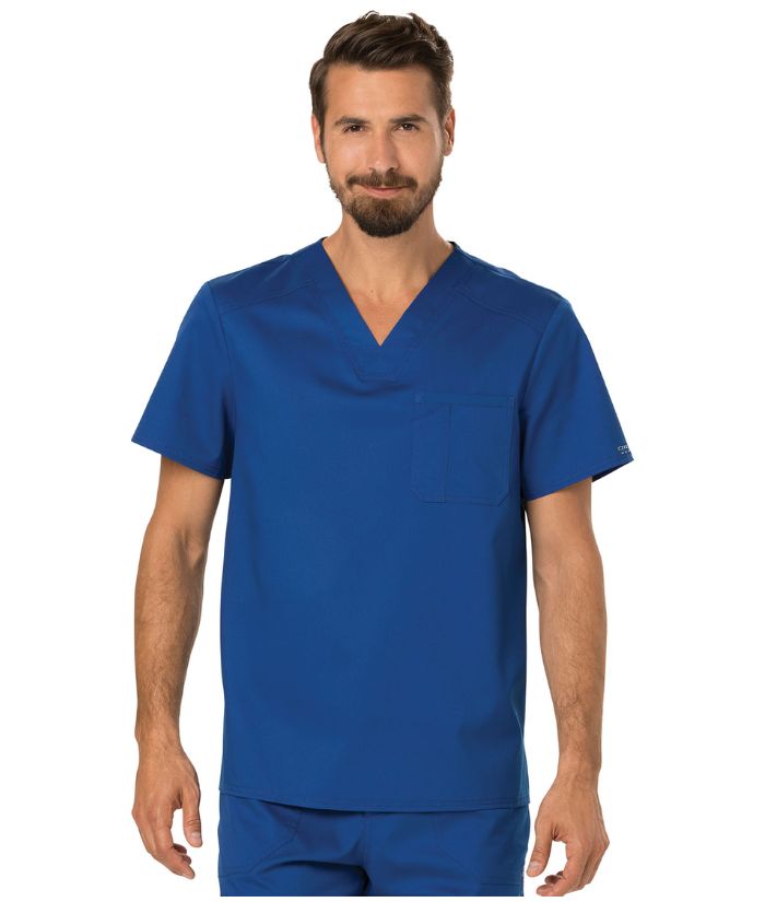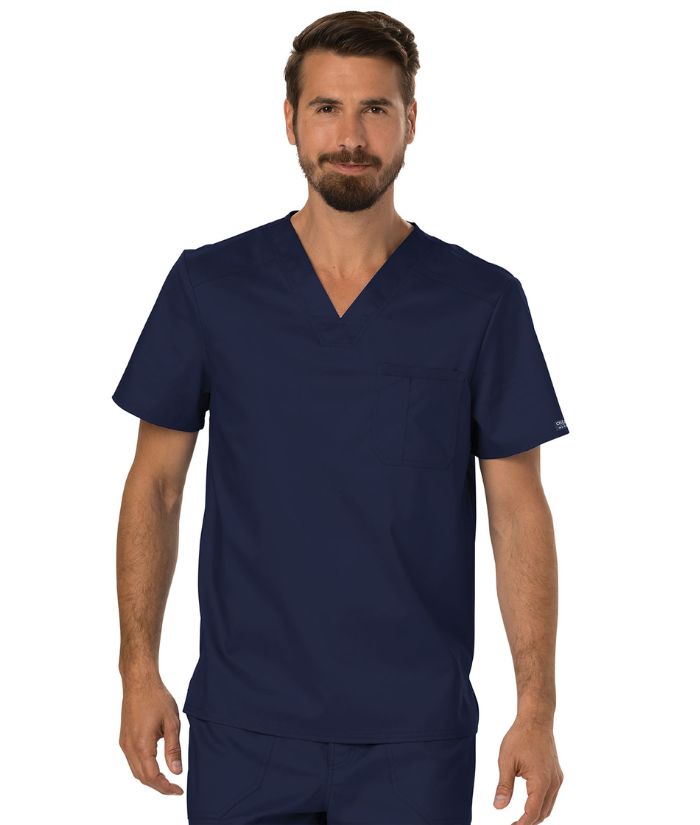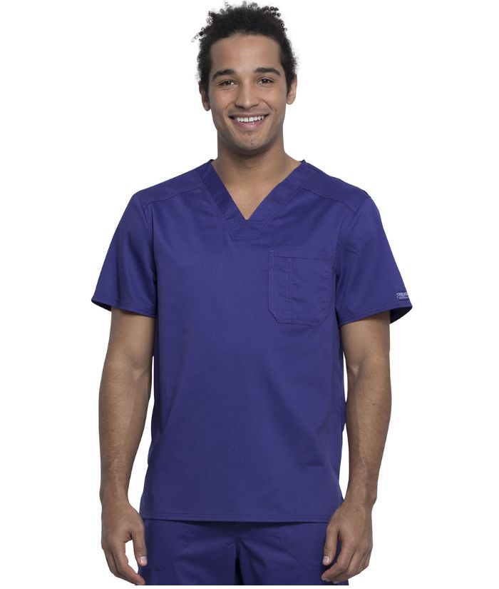 A Men's Modern fit V-neck top features a chest pocket with extra pen pocket, a back yoke and side vents. This style looks great tucked in or untucked.