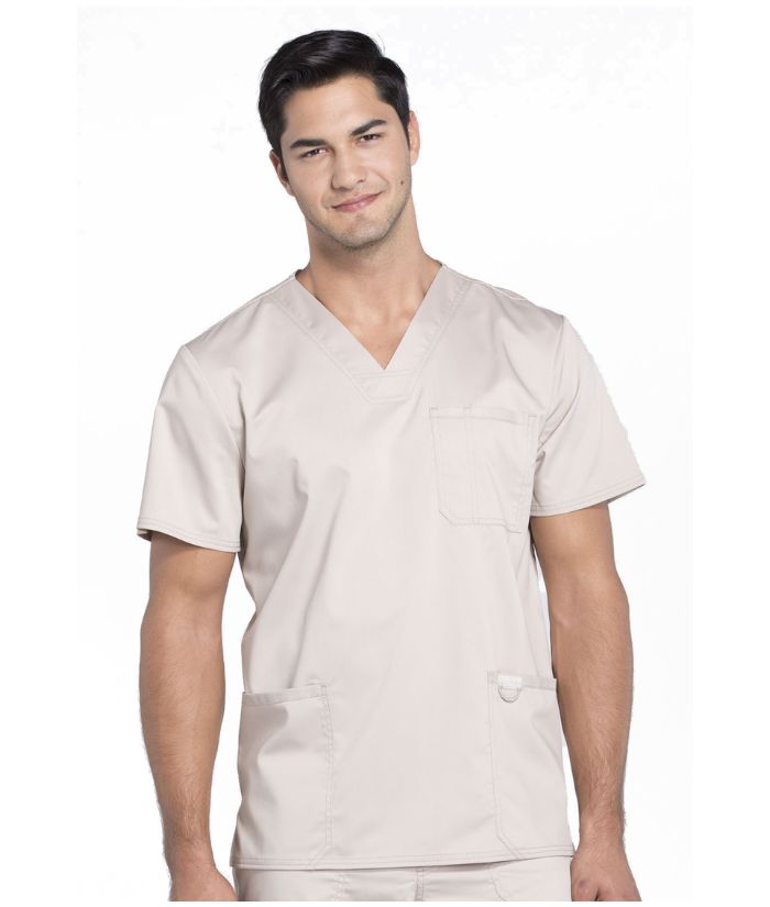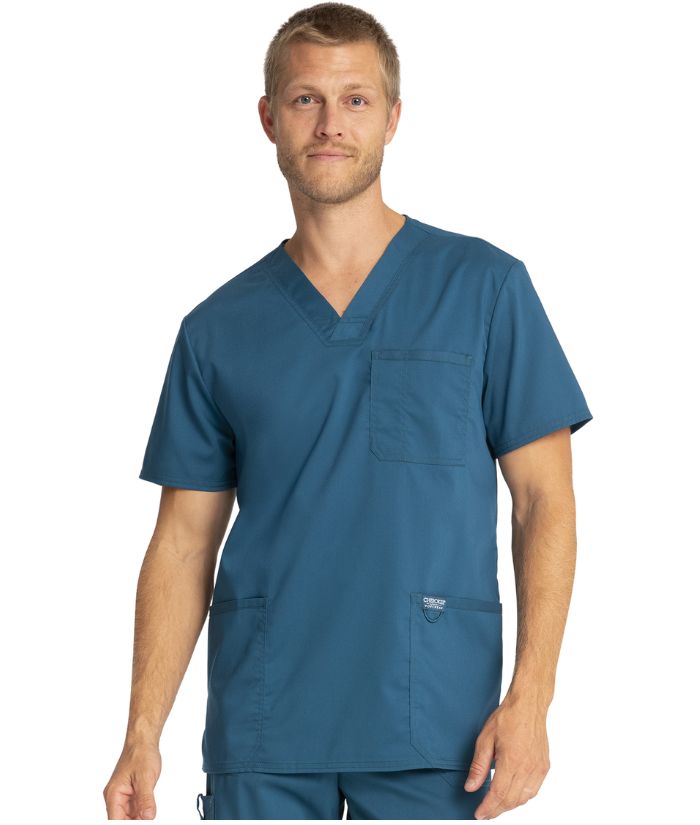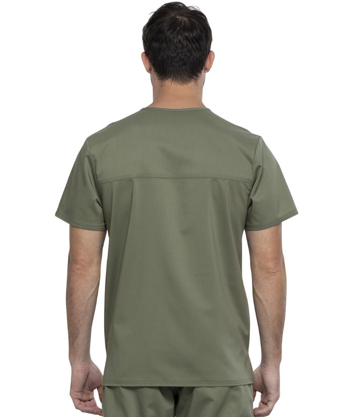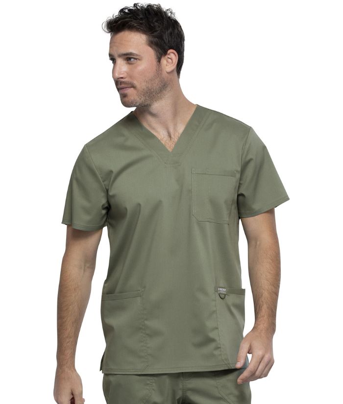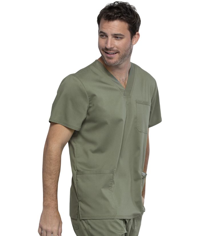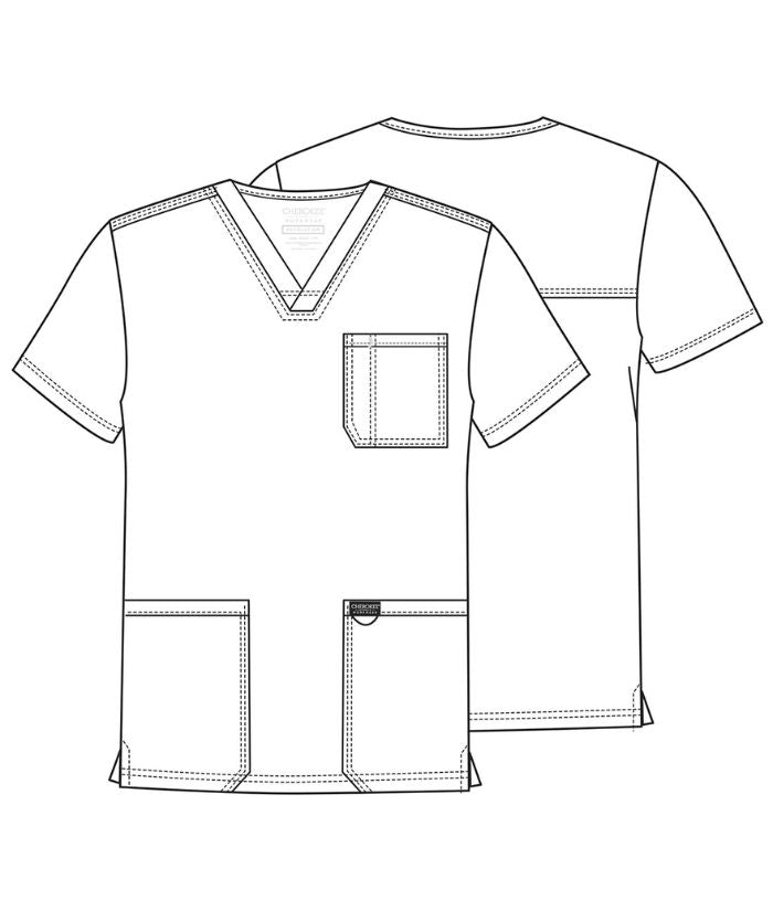 A Men's Modern fit V-neck top features a chest pocket with pencil stitch, two patch pockets, a logo label with I.D. loop, back yoke and side vents.