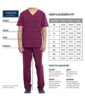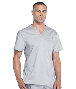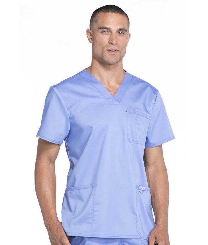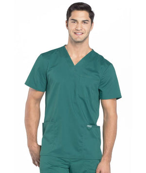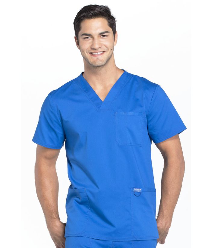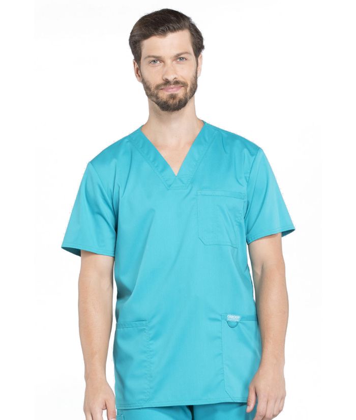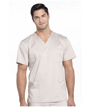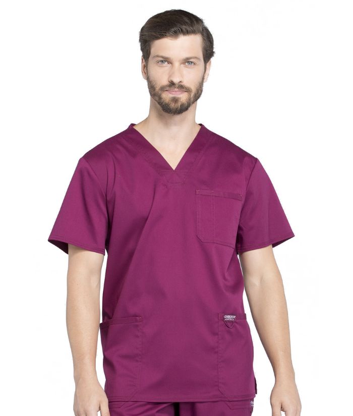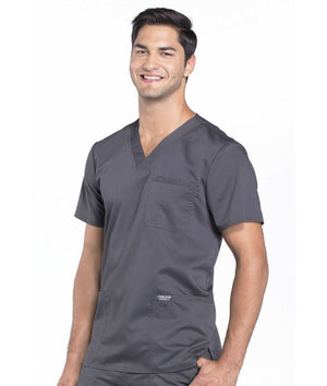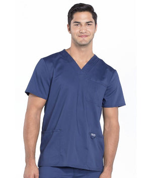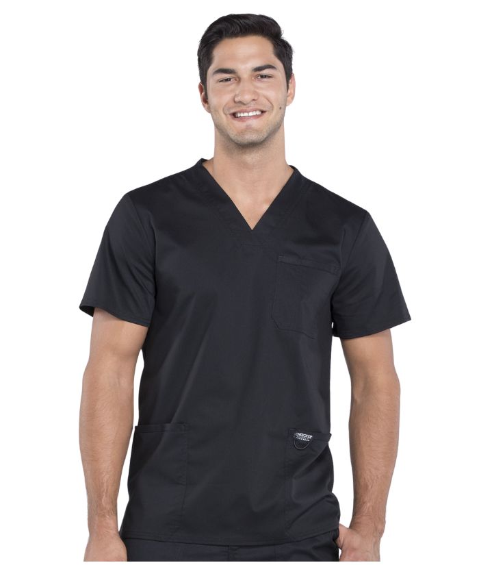 A Men's Modern fit V-neck top features a chest pocket with pencil stitch, two patch pockets, a logo label with I.D. loop, back yoke and side vents.