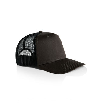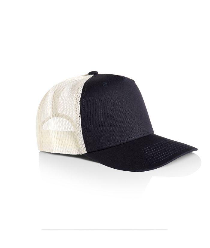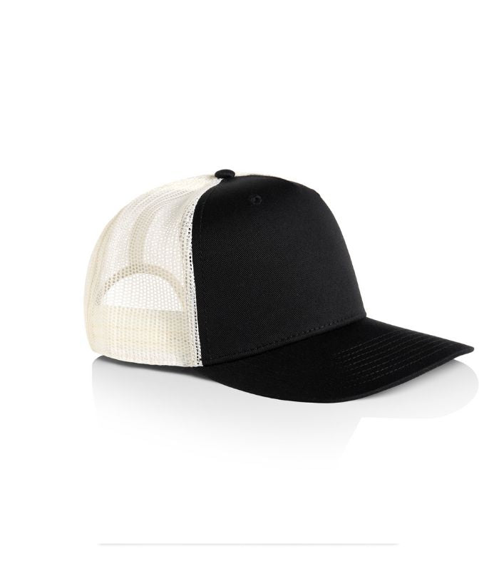 100% cotton front and peak, 100% polyester mesh back