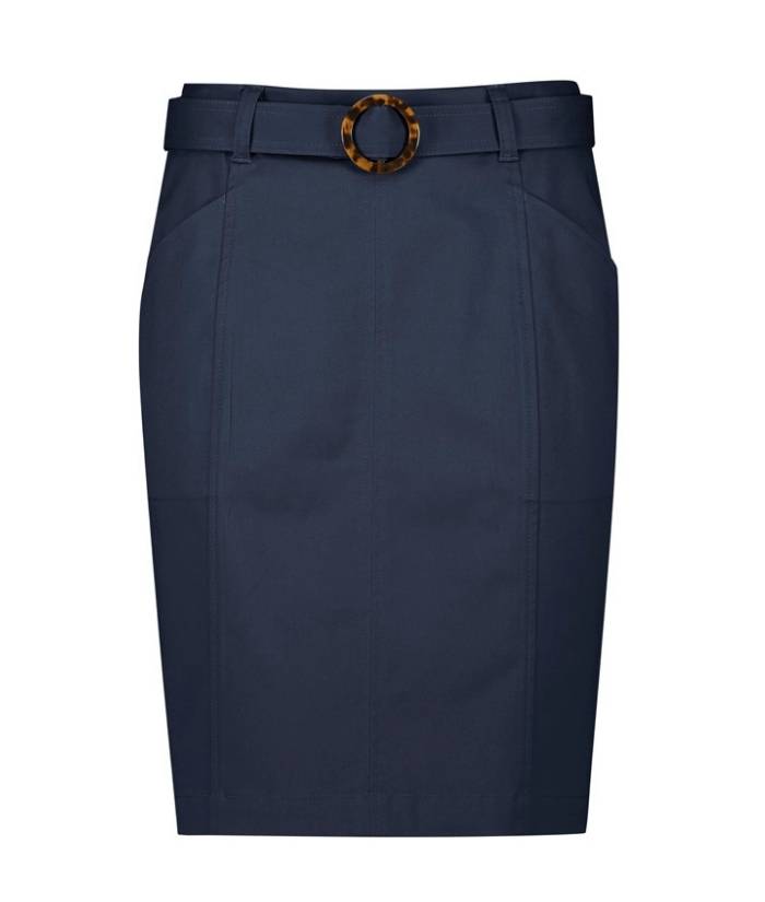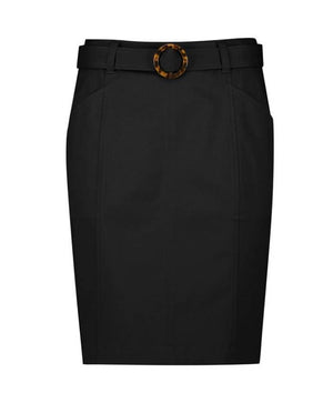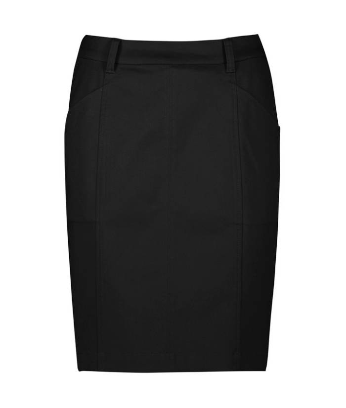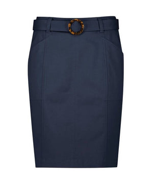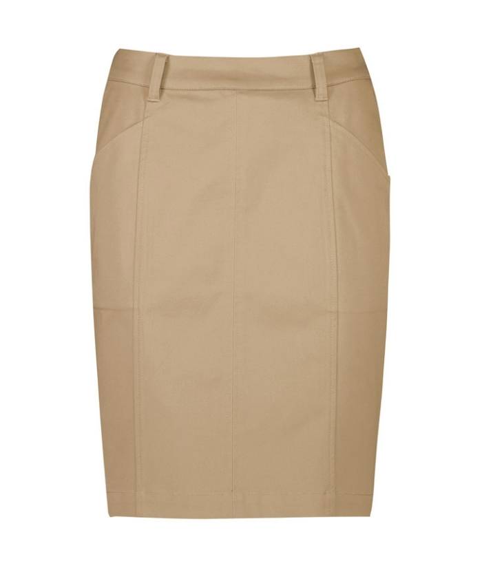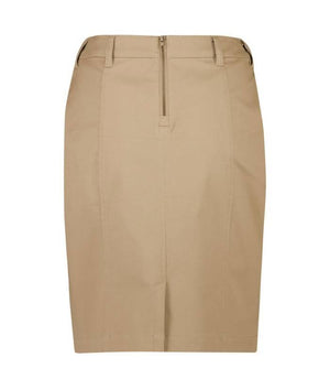 A modern Chino skirt featuring functional back split, non-gaping side seam pockets, metallic back zip feature, belt loops and modern trims. Pencil shape designed to finish mid length, but will vary depending on wearers height. Detachable belt included. Fabric has added stretch for comfort and easy movement