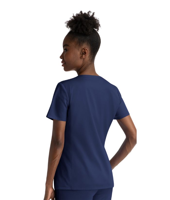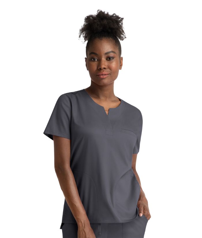 - Notched neck with hidden placket closure
