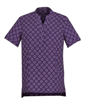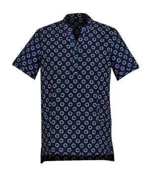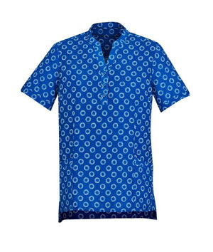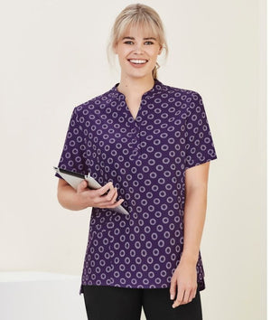 Style features longer hem lengths, short sleeve with cuff detailing, side splits