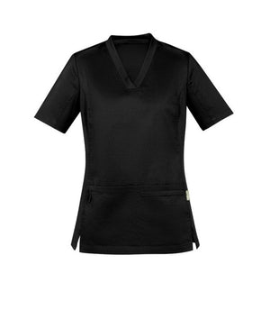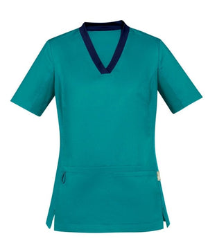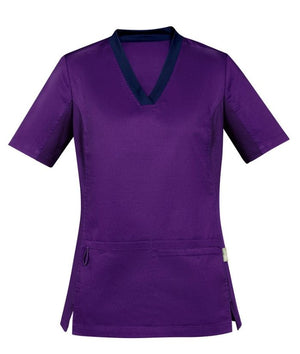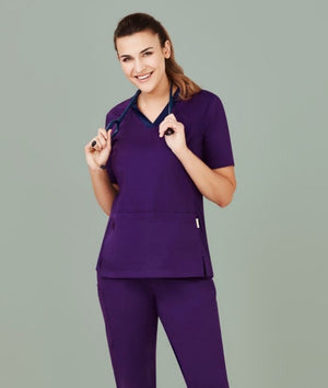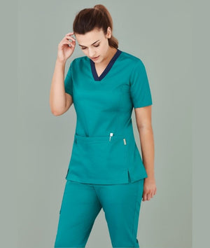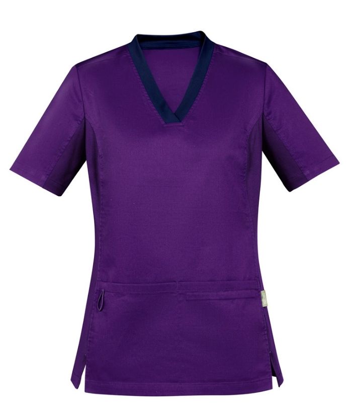 Scrub tops have antibacterial stretch side panels to provide ease of movement through the waist and arms