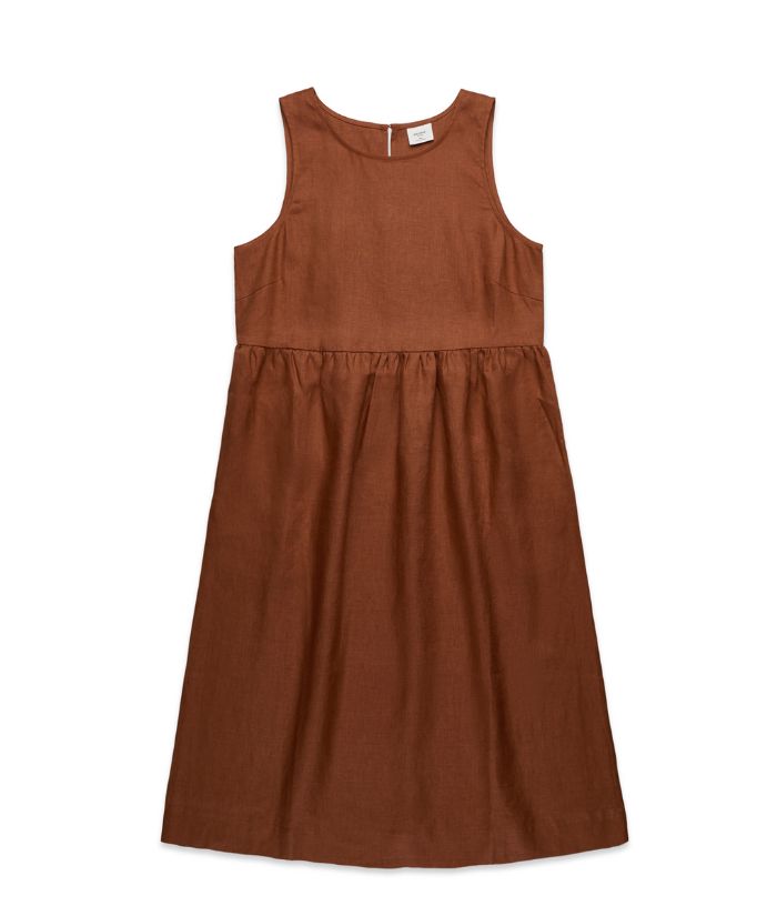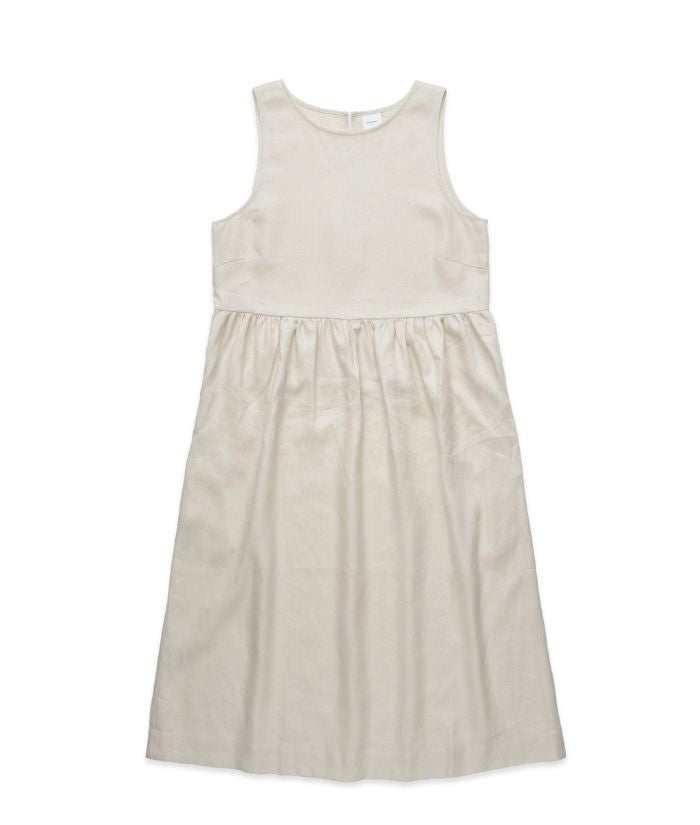 Mid length, sleeveless, back neck button fastening, concealed bindings, gathered at waist seam, side seam pockets