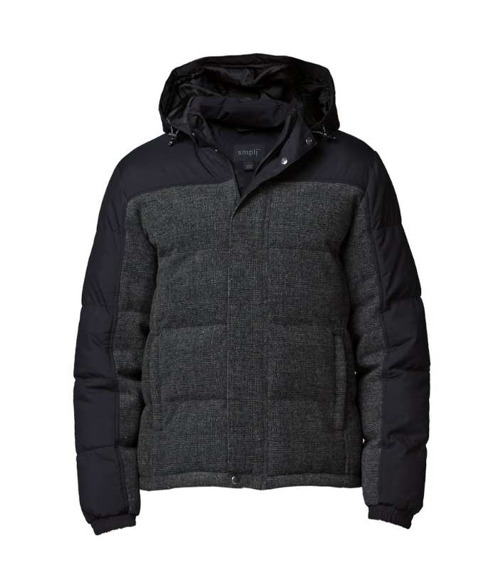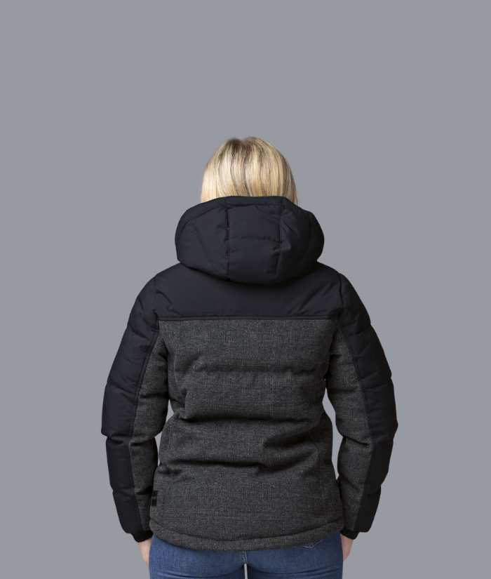 Faux wool grey check fabric on lower arm and front/back torso with water repellent rating 5,000mm, breathable