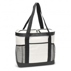 Large 26L cooler tote bag with PE foam insulation encased in a waterproof PEVA inner liner and a secure zippered top opening. The outer construction is robust 600D polyester with decorative ripstop nylon and smart white piping around the top. It has one large slip pocket and two mesh pockets on the front. Zero has extra wide woven handles that allow it to be carried by hand or on a shoulder.